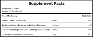 Vitamin D 600 IU, Calcium 1000 mg, Magnesium 400 mg & Zinc 25 mg